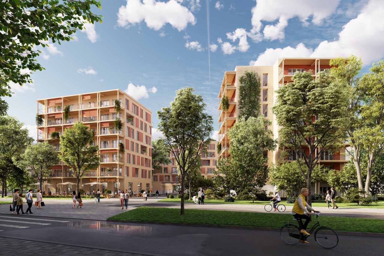 Abendsonne, Cafés, Grünflächen, Kinder, Treffpunkte – ein einladendes, warmes Entrée ins neue Quartier.